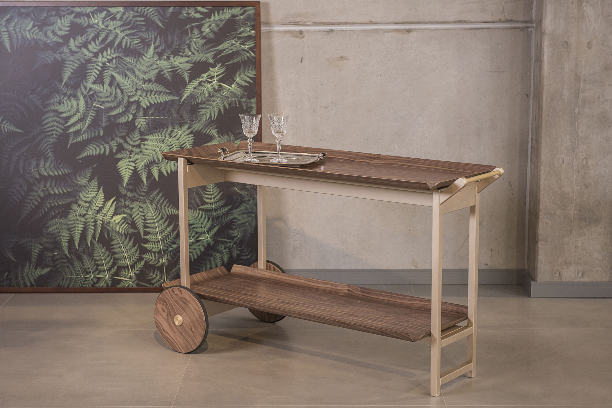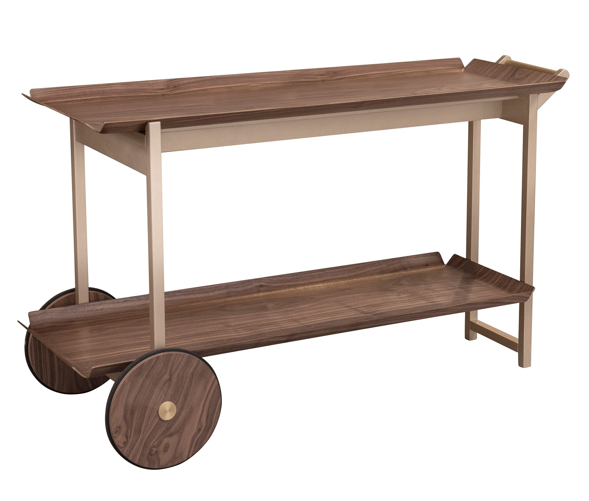 Mobilidade Escultural: Equipado com duas rodas traseiras de grandes dimensões em madeira maciça, com detalhe central metálico, o carrinho oferece um deslocamento suave e transforma as rodas em um elemento decorativo central.